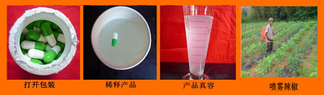 辣椒壯蒂靈膠囊:每瓶80粒。提高坐果量,抑制落葉、落花、落椒現(xiàn)象,促進辣椒發(fā)育膨大、著色紅、果肉厚、色澤鮮艷。適用于各品種辣椒。 每15公斤水中加本品1粒,第一次開花坐果后噴霧第1次,每間隔7天再噴第2次和第3次。每15公斤稀釋液可噴1畝地。用藥后要及時施肥和灌溉。產(chǎn)量才能大大提高。
