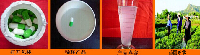 藥材根大靈膠囊:每瓶60粒?使藥材主根更粗壯,須根旺盛,高產(chǎn)優(yōu)質(zhì)。適用于山藥、黃連、烏頭、牛膝、防風(fēng)、柴胡、太子參、大黃、當歸、刺五加、人參、三七、獨活、黨參、白芷、川芎、龍膽、黃芩、丹參、地黃、板藍根、天麻、北沙參、南沙參、半夏、甘草、白術(shù)、芍藥、西洋參、桔梗、苦參、葛根、山豆根、拳參、何首烏、白首烏、紅藥子、白藥子、防己、延胡索、升麻、威靈仙、續(xù)斷、蒼術(shù)、羌活、莪術(shù)、商陸、白蘞、白茅根、蘆根、天南星、白頭翁、前胡、三棱、黃芪等各種長根藥材加強根系發(fā)育。 每15公斤液體中加入本膠囊1粒,也可以加多粒,攪拌溶解后噴霧于植物表面。每畝每次一般用2粒,配60市斤水噴霧。本品PH值中性,遵照使用要求稀釋后噴霧,亦可以和各種農(nóng)藥及葉肥混合使用。稀釋液存放保質(zhì)期30天。